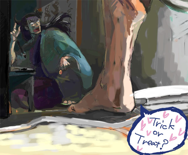 (サムネ表示)もはやハロウィンとなにも関係Neeeeeee 同人じゃお約束なそっちの悪戯のネタを描いておこうかと思い。 左近だったら「見せびらかす程の立派な物じゃないね」と軽くあしらいそうですが 相手が化け物並の大筒だったのかしら(自重 左近の白目を描けて幸せです。 とりあえず相手は殿じゃありません(きっぱり)