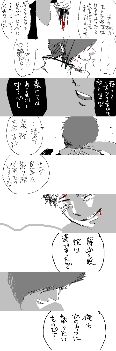 島津と徳川の和平の交渉中にも傷を意識してこんな所で逝ってたまるかと歯を食いしばって島津を見ていればいい。